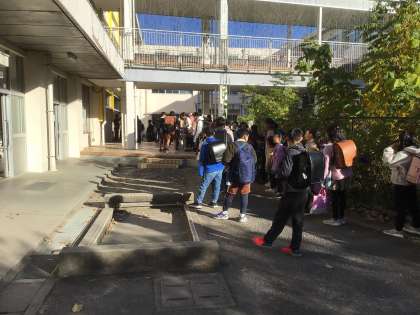 南舎南、北舎南、北舎西に通学団に分かれて並びました。