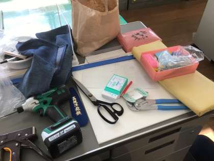 公務手さんが形に合わせて器用に布を縫い、順番に背の部分を取り替えています。