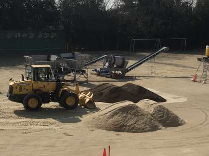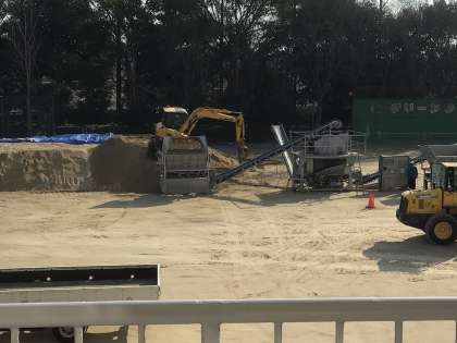 いよいよ土の混ぜ合わせが始まりました。 車両も増えて、砂山ができています。