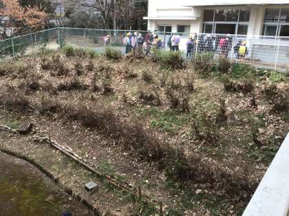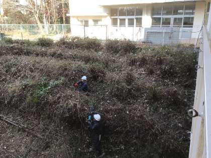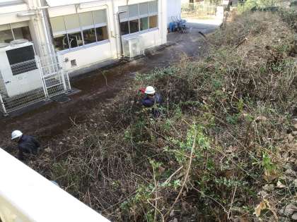 土曜日に、北舎昇降口前の長く伸びたつるとニセアカシアの伐採を行いました。