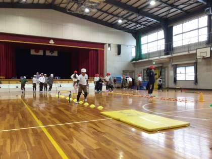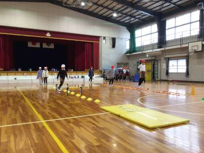 グループごとに作った小型ミニハードル走のコースをみんなで試しています。