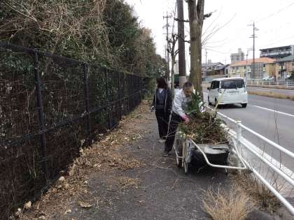 公務手さんたちが歩道に出た小枝を切りました。 業者による木の伐採とあわせて、さっぱりしました。
