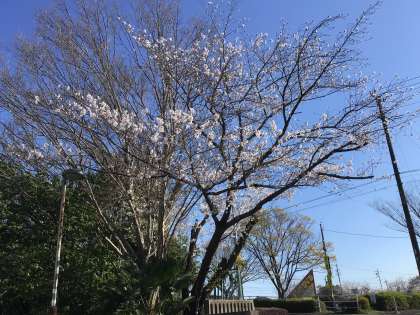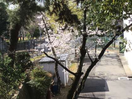 校門の桜が春の陽射しを受けて満開に近づきました。