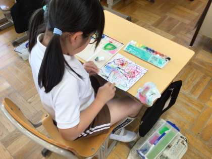 ビー玉や歯ブラシを使ったり、絵の具の水滴をストローで吹いたりして様々な描き方を楽しみました。
