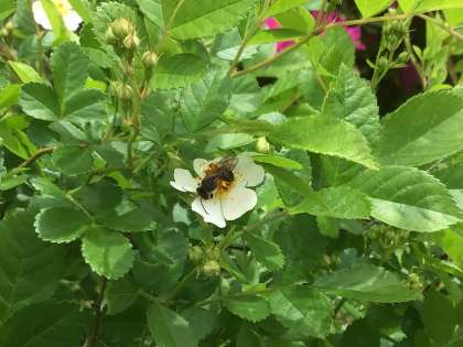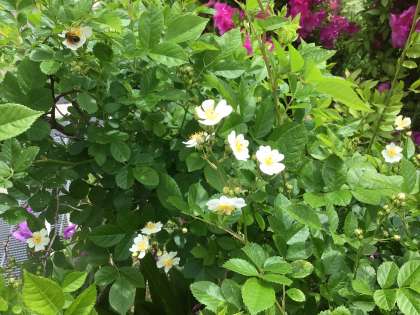 小ぶりのかわいい薔薇の蜜を、小ぶりのはちさんが必死に集めています。