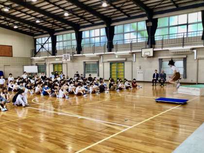 代表の児童が、ジャンピングボードで二重飛びを試演しました。