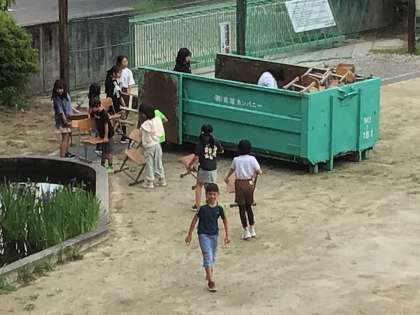 コンテナに使えなくなった古い机や椅子を積み込みました。