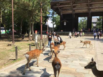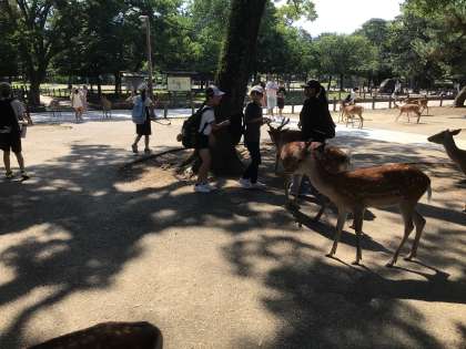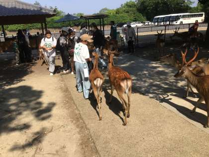 奈良公園で鹿にせんべいをあげました。 こんな近くに鹿がいるのは、ここくらいですね。