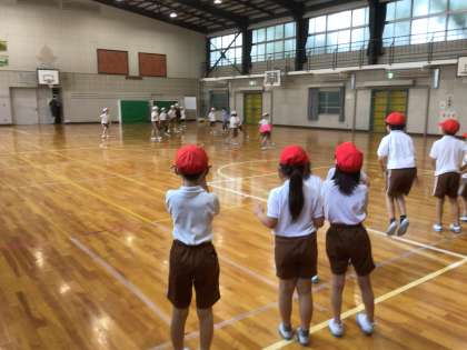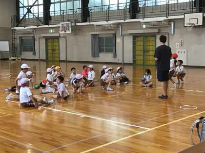 体育館でお楽しみ会をしていました。 みんなでキックベースをして盛り上がっていました。