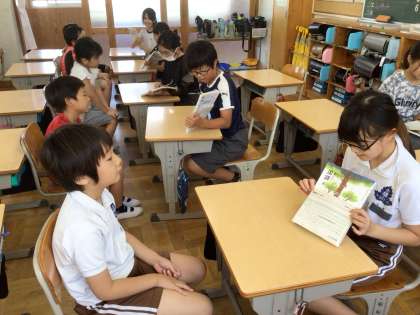 朝のTタイムに2年生に披露し、作品のおもしろさや工夫を伝えました。