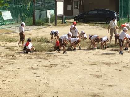 体育委員会の呼びかけで、全校児童と先生で、草取りと石拾い活動を行いました。
