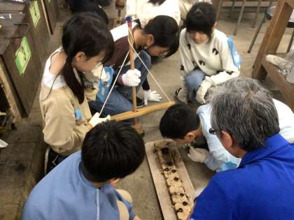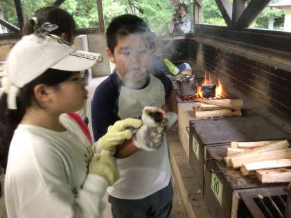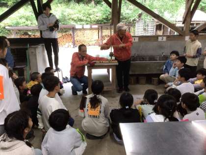いよいよ火おこしです。 職員の方の説明を聞いてチャレンジします。