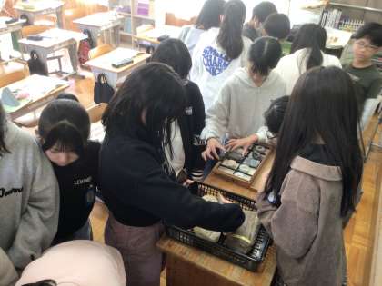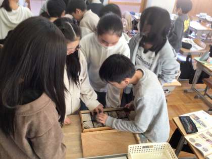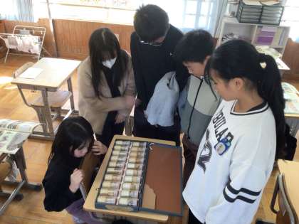土橋小学校の運動場のボーリング試料や地層に含まれる化石を見ました。