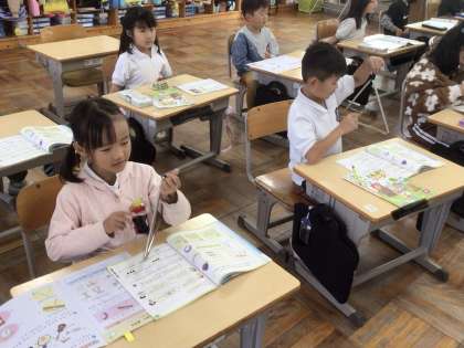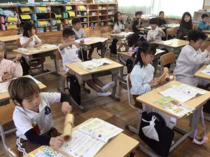 ウッドブロック、トライアングル、すず、カスタネットを使ってリズム打ちをしていました。