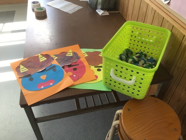 鬼に見立てた段ボールを倒して、鬼をやっつけました。