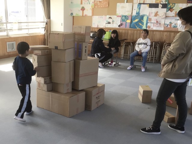 その後は、大きな段ボールを積んだり壊したりして、楽しそうに活動していました。