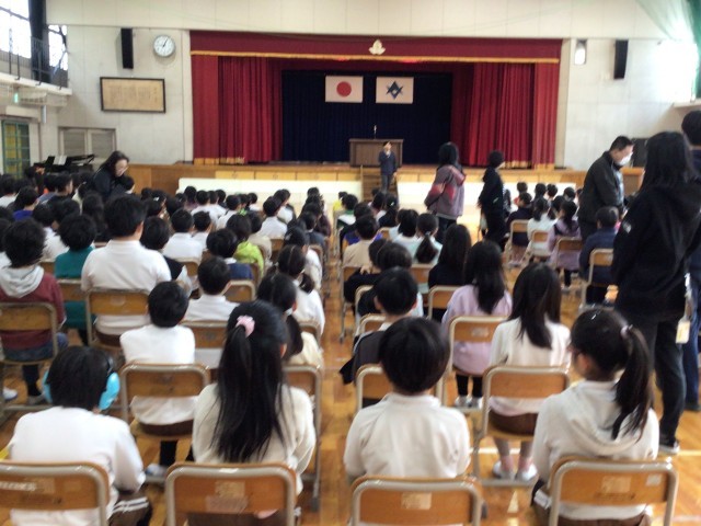 今日は1年生をから5年生が椅子を持って入場し、姿勢よく座ったり号令に合わせて礼をしたりするなど、式典の所作を学びました。