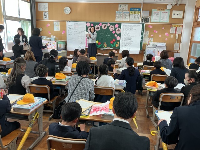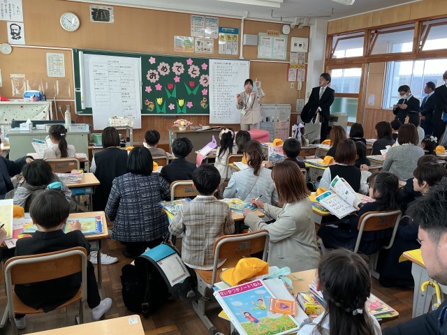 新1年生のはじめての教室でのようすです。お家の方といっしょに先生のお話を聞きました。