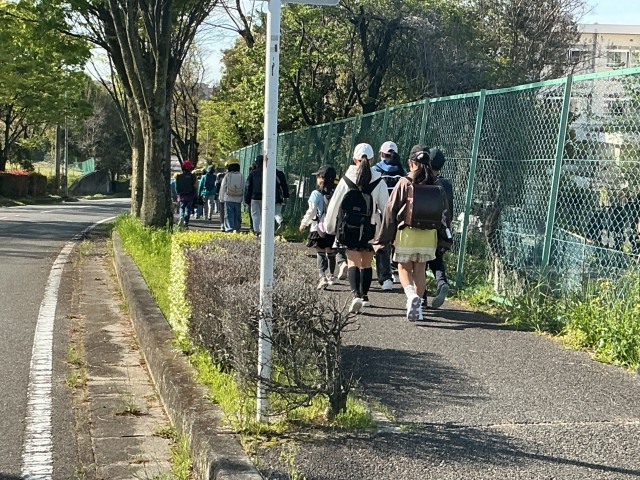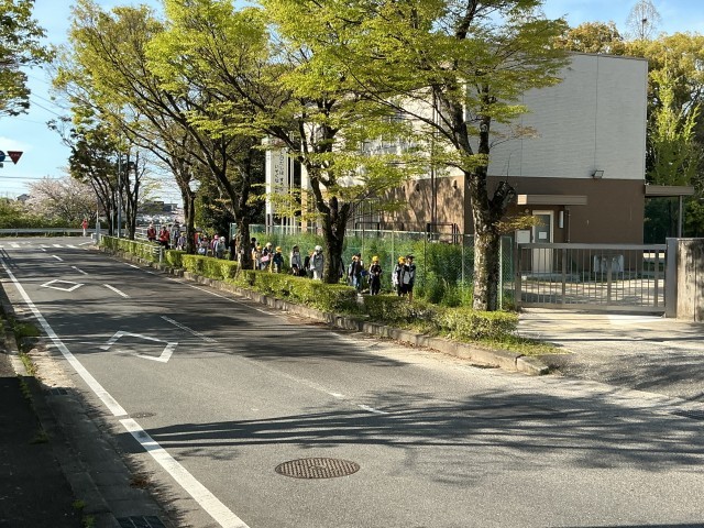 今日から、通学団での登校が始まりました。見守り隊の方に見守られながら、一列に並んで安全に登校しています。1年生を昇降口まで送るやさしい6年生の姿も見られました。