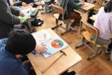 4年1組 図工 版画 下絵を版木に写して、いよいよ彫りに入りました。 みんな集中...