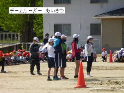 まず、「借り人競争」を行いました。各学年(縦割り)で1人、くじで引かれた児童を「借り人」としてチームリーダーが引き連れてトラックを1周します。
