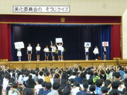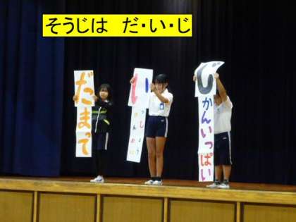 6月22日 児童集会 美化委員会 公開日 2023/06/23 更新日 2023/06/23 学校の特色ある活動 クリーンレンジャーが、 「今日は美化委員が掃除の仕方について連絡してくれるよ。しっかり聞いて、正しく掃除ができるようにしようね!それでは美化委員の皆さん、お願いします。」と紹介し、集会が始まりました。 掃除用具の使い方や そうじは だ・い・じ の約束を確認しました。