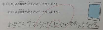 「写真を撮るときのマナーは大丈夫?」「あやしい画面が出てきたらどうする?」という課題について考えました。
