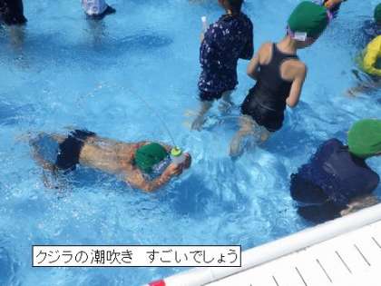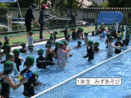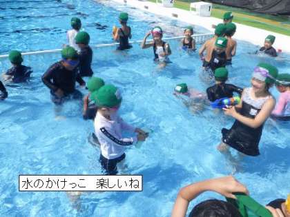 7月18日 1年生 みずあそび 公開日 2023/07/19 更新日 2023/07/19 各学年から 1・2時間目に 1年生は 生活科の学習もかねて プールで水遊びをしました。どのこも 水が顔にかかっても へっちゃらです。お友達に潜って近づき、お水をかけるなど わんぱくぶりを発揮する子もいました。 楽しかったプールでの学習は、今日でおしまい。また来年、もぐったり、泳いだりして泳力を伸ばしましょうね。