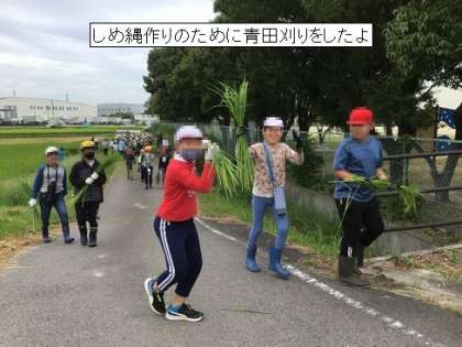 5年生は、お正月飾りのしめ縄を作るために、青田刈り体験をしました。稲が実った後の藁で作られることが多いしめ縄ですが、堤小では綺麗ににそろった稲わらを準備するために 青田刈りをしています。5年生で稲アレルギーではない子が、先生方が刈って渡してくださった稲を1房ずつ干して、しめ縄作りに向けて 準備をしました。