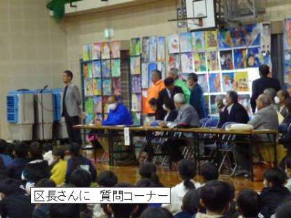 区長さんへの質問コーナーでは、「なぜここに堤小学校を建てたのか」「校歌の歌詞はどうやって決めたのか」などに 答えていただきました。