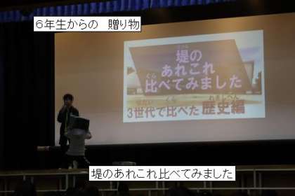 6年生からのプレゼントは、「堤のあれこれを比べてみました!!」です。自分たち・父母・祖父母の3世代の堤小学校への思いを比べた調査の発表です。