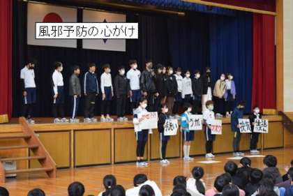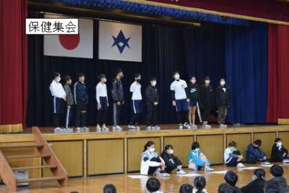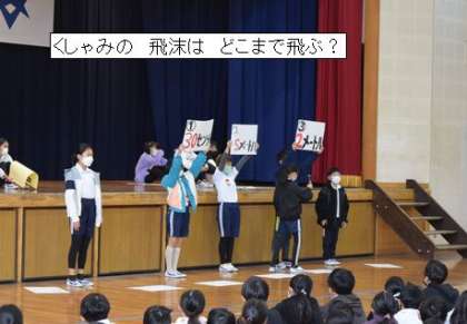 11月 30日 児童集会(保健) 公開日 2023/12/01 更新日 2023/12/01 学校行事 児童集会を行いました。 今朝の担当は、保健委員会です。風邪について、寸劇やクイズを通して、楽しく伝えました。 くしゃみは、なんと5メートル以上へ飛沫を飛ばします。風邪気味の子は、マスクをすると感染予防になりますね。そのほか、手洗い・うがい・換気・生活リズムと 新型コロナウィルス感染予防で学んだことを生かしましょう。