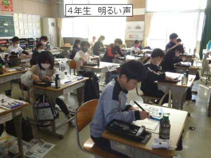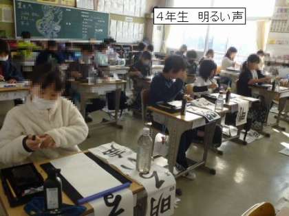 4年生です。どのような気持ちで書き初め大会に臨めばよいのか、真剣に先生の話を聞く姿がありました。