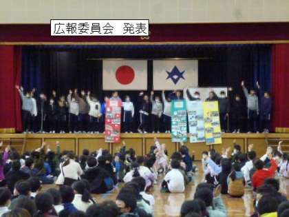 朝、児童集会が行われました。広報委員会が自分達の活動を 寸劇にして発表しました。