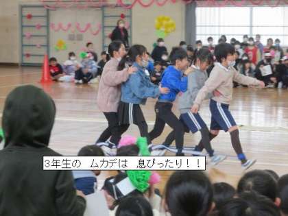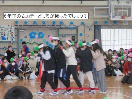 思い出クイズをフレンズで考えてもらいました。また、運動会で行ったムカデ競争を6年生の代表に体験してもらいました。