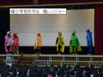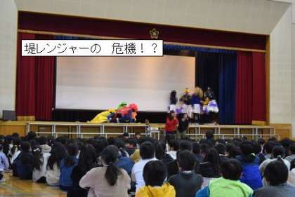 堤レンジャーの危機を 全校の声援で助ける 楽しい劇で 大盛り上がりでした。