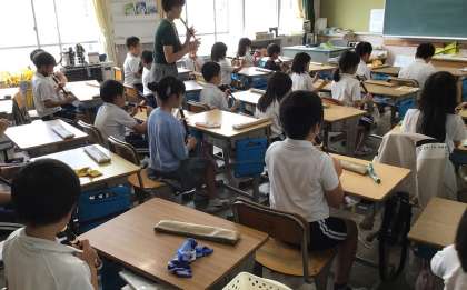 3年生になると、音楽の授業でリコーダーの演奏が始まります。この日は、外部講師を迎え、講習会を開きました。「姿勢」「シャボン玉の息」「指先の豆」など、基本となることを学びました。
