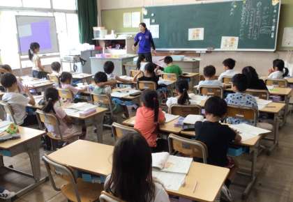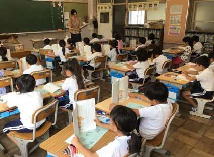 1年生の国語では、「かいがら」というお話を読んでいます。場面の様子や登場人物の行動などをとらえ、内容や感想などを伝え合ったり、「くまのこ」と「うさぎのこ」に分かれて演じたりします。