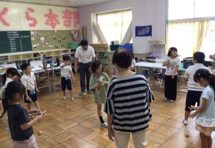 1年生が生活科で昔遊びに挑みました。おはじきやけん玉、こま回し、お手玉、あやとりなど、地域の皆様を講師にお迎えして活動しました。