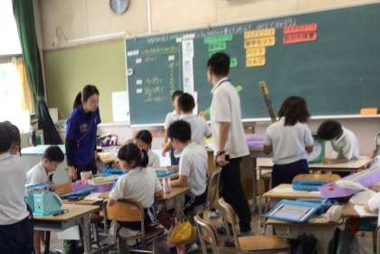 3年生の算数では、重さの学習をしています。この日は、1kgの量感をもとにして、身のまわりのものの重さを見当づけ、適切に秤を選択して測定する活動でした。