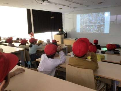 1年生では、生活科「むしとなかよくなろう」で、校庭でバッタなどを探し、飼育する活動を行っています。この日は、豊田市自然観察の森に出かけ、自然観察の基本、虫が育つ場所、体のつくりなどについて学んできました。