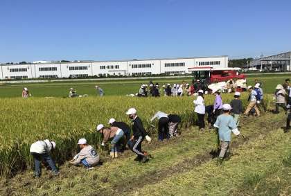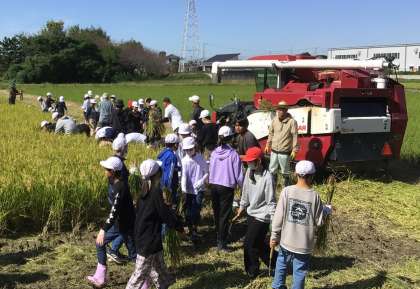 5年生が、稲刈りをしました。活動を通して、協力の大切さ、農機具の工夫について学び、日頃の食事や生産にかかわる人々への感謝の気持ちを育みました。