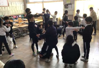 今回のハッピーアワーは5年生が企画・運営しました。異なる学年が集まって、「木の中のリス」というゲームなどで遊びました。活動の後、子どもたちは笑顔で教室に戻りました。