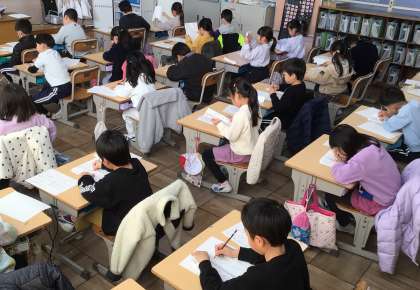 書き初めをしました。昨年から学校でも書き、冬休みに家でも練習しました。1・2年生は硬筆、3年生以上は毛筆です。
