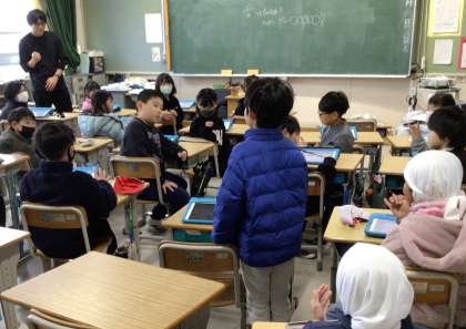 俳句を学んでいる3年生では、さっそく5・7・5にまとめる様子が見られました。「季語は」という問いに、「冬!」と一斉に答えていました。