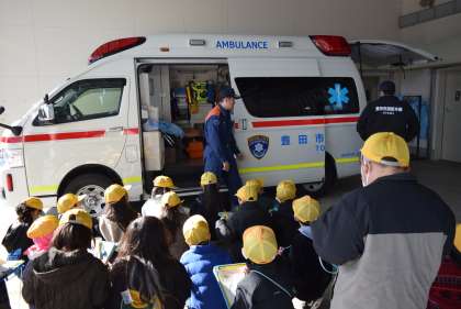 3年生が社会科「火事からくらしを守る」の学習で、南消防署高岡出張所に出かけました。施設の見学もしましたが、隊員の皆さんが緊急時にあっという間に準備をして出動する様子を見て、そのはやさに驚きました。人々を守るために訓練を積んでいることを学びました。