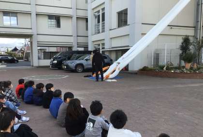 3年生が救助袋を使って3階から避難する体験をしました。命を守るための学習であり、1月に学習した社会科「火事から学校や人を守るための工夫」に関連する学習でもあります。