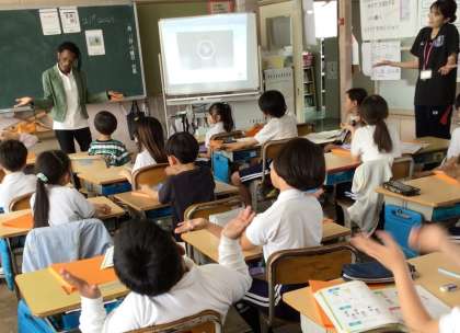 中学年で「聞くこと」「話すこと」を中心とした活動、外国語に慣れ親しむ「外国語活動」に取り組んでいます。高学年から「読むこと」や「書くこと」も加わり、外国語科の学習が始まります。