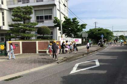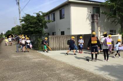 児童会活動の一環で、運営委員会が、朝のあいさつを大きな声でさわやかに行うことをねらいとして「あいさつ王をつかみとれ!〜It’s morning time !〜」に取り組んでいます。校門では、よいあいさつをしている子にシールを渡す活動などを行っています。また、登校途中の通学路では、通学団の班長が自分たちのあいさつを確認し、通学団ごとに点数を競う活動もしています。そして、すてきなあいさつをできた子や班を、昼の放送で紹介しています。