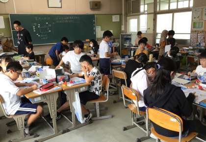 乾電池を使ってモーターを回し、電流が流れる向き、直列・並列につないだときの電流の大きさなどを調べています。